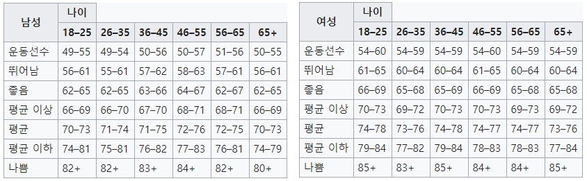 심박수는 1분당 맥박수를 표현하는 것으로 우리가 보통 심박수 정상수치 확인 할 때에는 휴식기 심박수, 즉 편안한 자세로 앉아있을 때의 수치를 측정하게 됩니다. 이 때 심박수 정상수치 연령별 성별 따라서 다른데요. 일반적으로 성인 정상 심박수는 분당 60~100회 입니다. 각 연령대별 심박수 정상수치 기준은 아래 표를 참고하시면 됩니다.